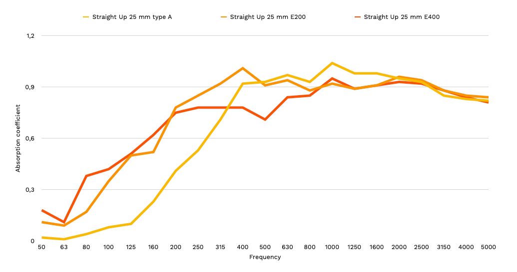 25 mm: NRC 0.85-0.90 per ASTM C423. Alpha W 0.85 (class B)-0.95 (class A) per ISO 354/ISO11654.